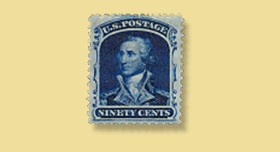 Below is a ninety-cent early U.S. stamp. The Scott Catalogue Identifier leads you to the conclusion that you may have a U.S. #39 from 1860 which has a Scott Catalogue value of $10,000.00 or it could be a U.S. #47 which is not known used and has an unused value of $4,500.00. The 2011 Scott Specialized Catalogue has a note under the listing for the U.S. #39 which says “all used examples of the No. 39 must be accompanied by certificates of authenticity issued by a recognized expertizing committee.” The reason for this note is the preponderance of U.S. #39 stamps with counterfeit cancels and/or alterations or faults. The alterations and faults will significantly affect the value of the stamp. Needless to say a counterfeit marking is not in the least desirable.